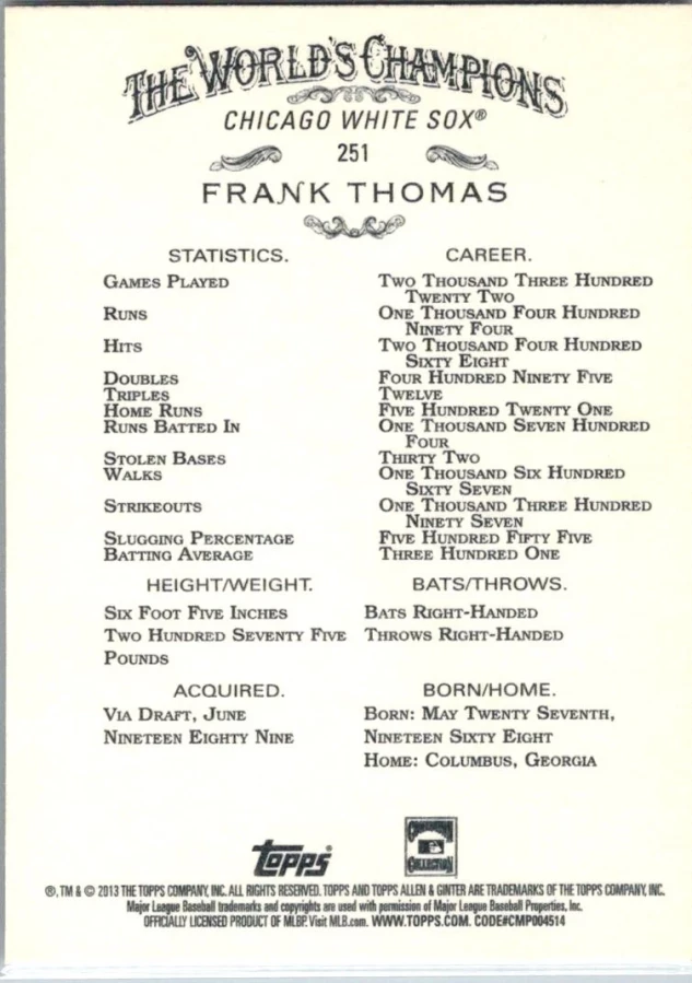 This is a nice example of a 2013 Topps Allen & Ginter #251 Frank Thomas