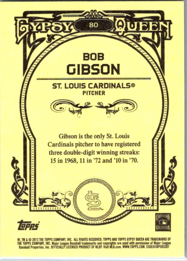 This is a nice example of a 2013 Topps Gypsy Queen #80 Bob Gibson