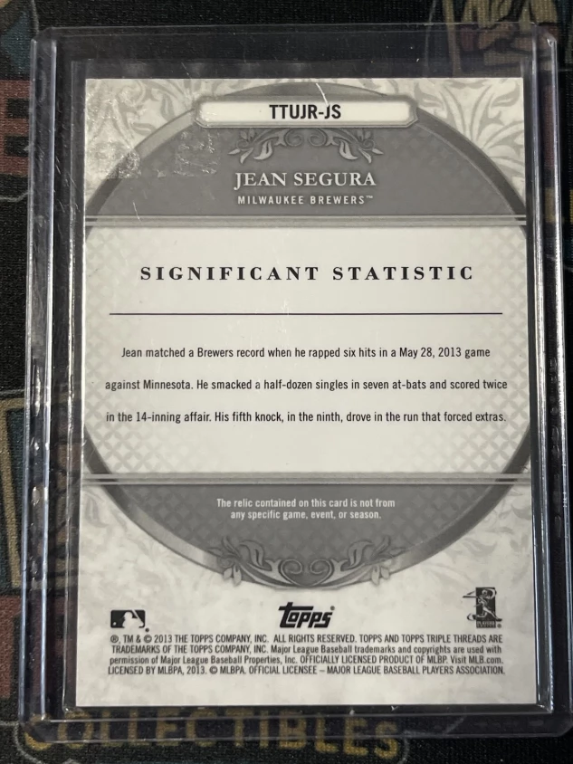 This is a nice example of a 2013 Topps Triple Threads #TTUJR-JS Jean Segura Unity Relics