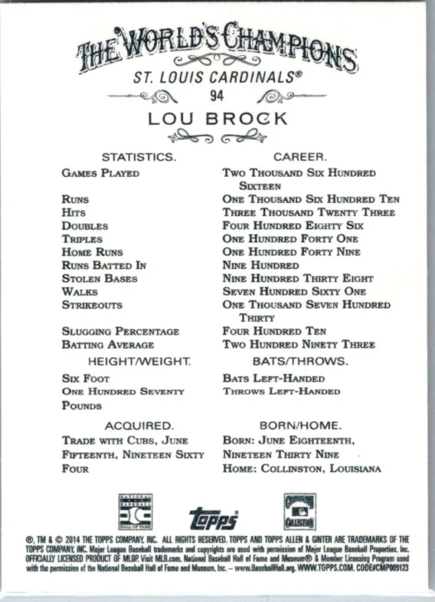 This is a nice example of a 2014 Topps Allen & Ginter #94 Lou Brock