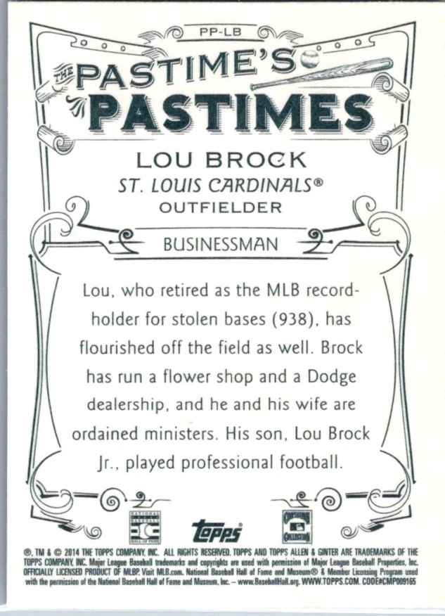 This is a nice example of a 2014 Topps Allen & Ginter #PP-LB Lou Brock Pastime's Pastimes
