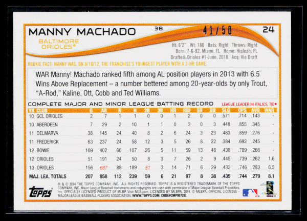You are purchasing a 2014 Topps Manny Machado #24 Pink /50 Future Stars. You will receive the exact item in the photographs. Thank you for looking.