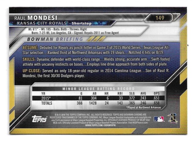 2016 BOWMAN CHROME VENDING '16 BOWMAN #149 RAUL MONDESI (RC)