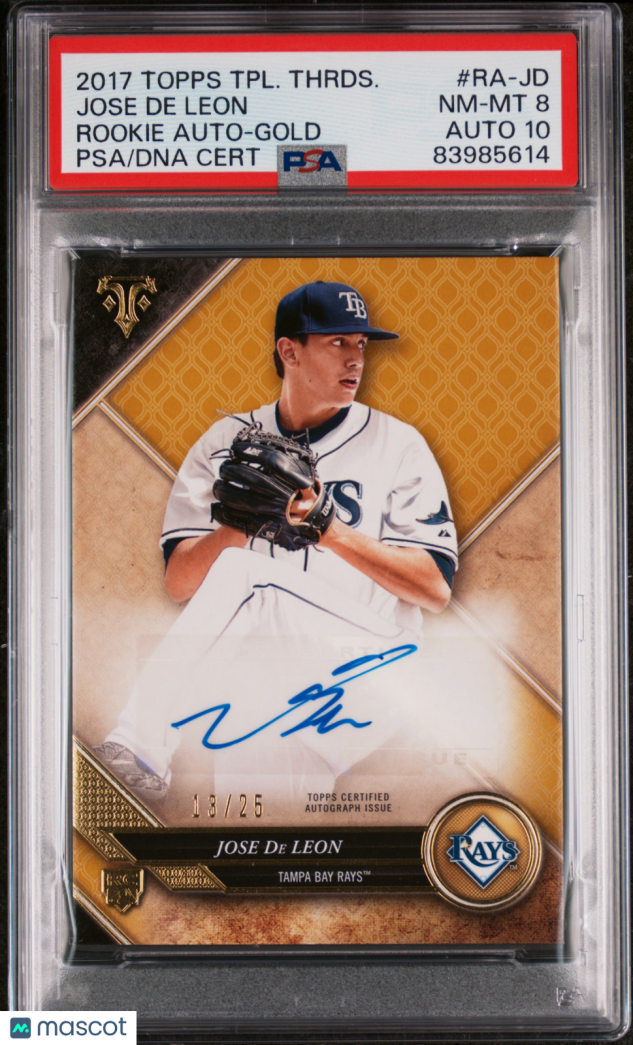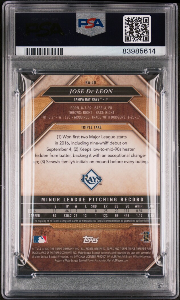 You are purchasing a 2017 Topps Triple Threads Jose De Leon #RA-JD Gold Auto /25 RC PSA 8 Auto 10. Thank you for looking.