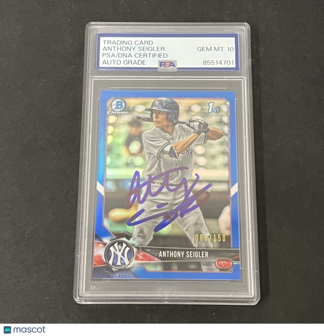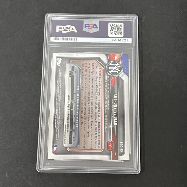 This listing features a 2018 Bowman Draft #BDC-65 86/150 Anthony Seigler, professionally PSA authenticated.