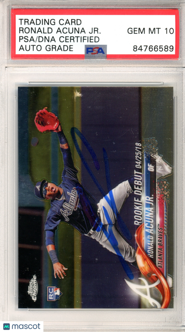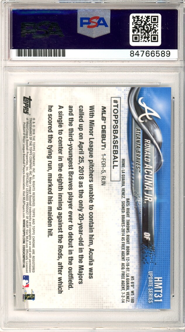 You are purchasing a 2018 Topps Chrome Ronald Acuna JR. #HMT31 RC On Card Auto PSA 10. Thank you for looking.