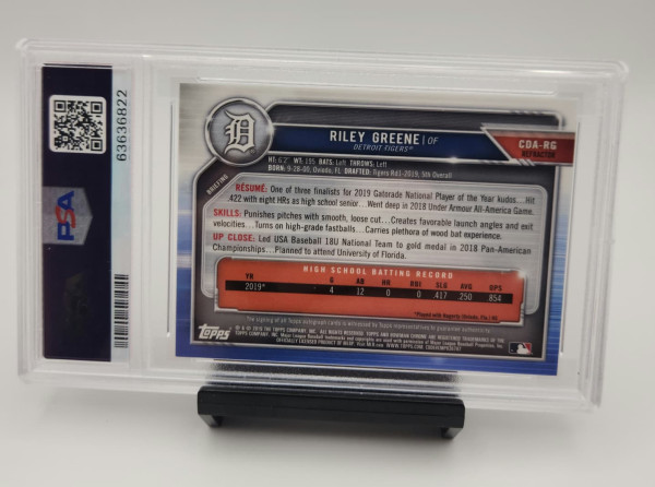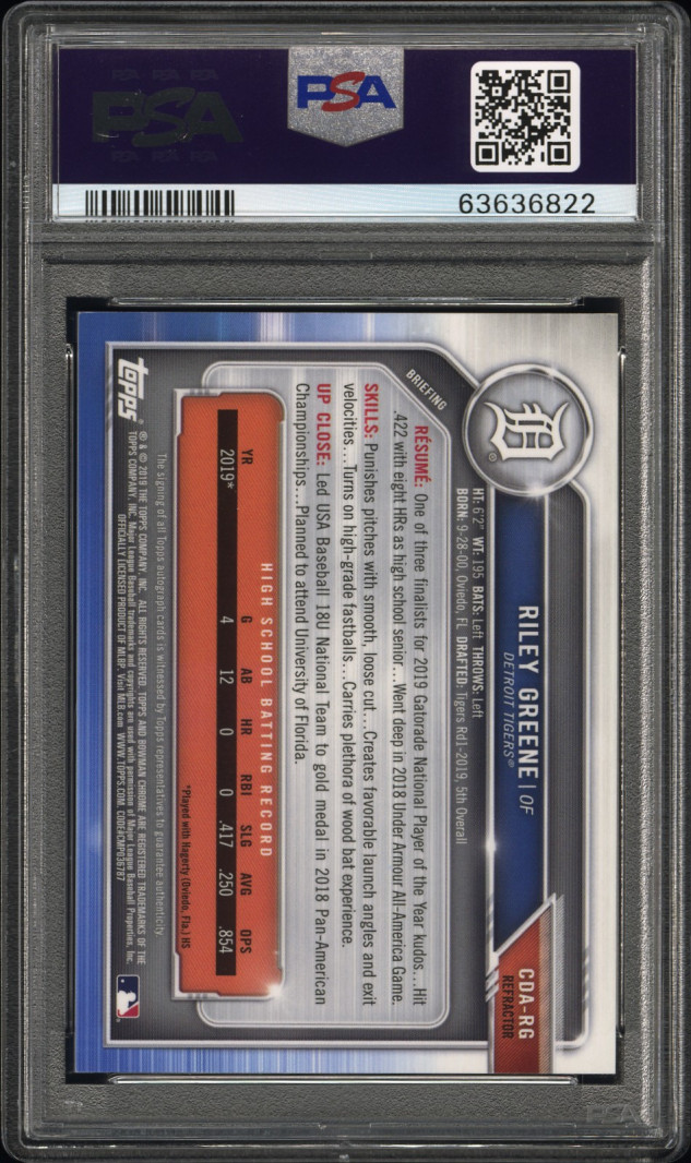 This card was produced when Greene was still a highly touted high school prospect โ€” drafted by the Detroit Tigers in the 1st round (5th overall) of the 2019 MLB Draft from Paul J. Hagerty HS in Oviedo, FL Baseball-Reference.com. Getting in early on a PSA 10 auto from his rookie year is a move collectors will look back on.