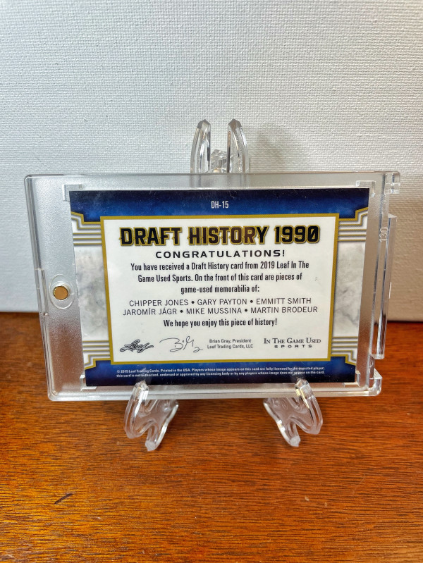 This is (1) 2019 Leaf ITG Chipper JONES Emmitt SMITH Mussina Jagr Brodeur Payton Patch #/15. Thank you for checking out my listing!