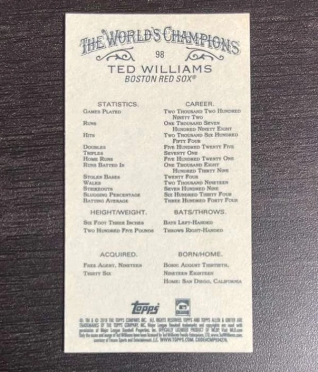 This is a nice example of a 2019 Topps Allen & Ginter - Mini Black Border #98 Ted Williams