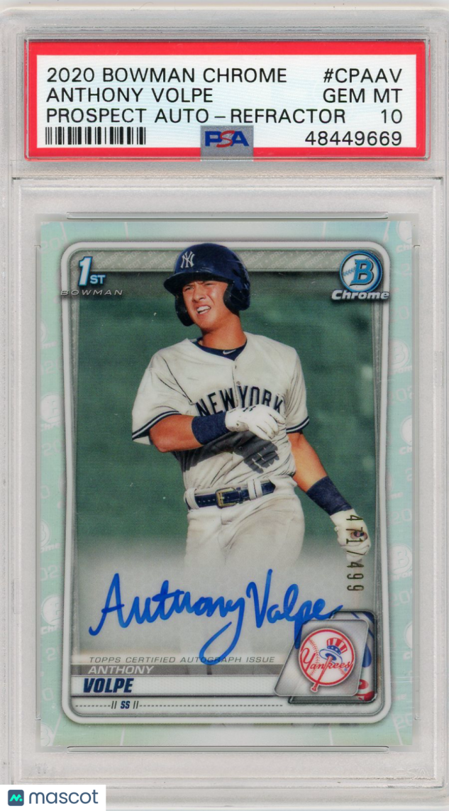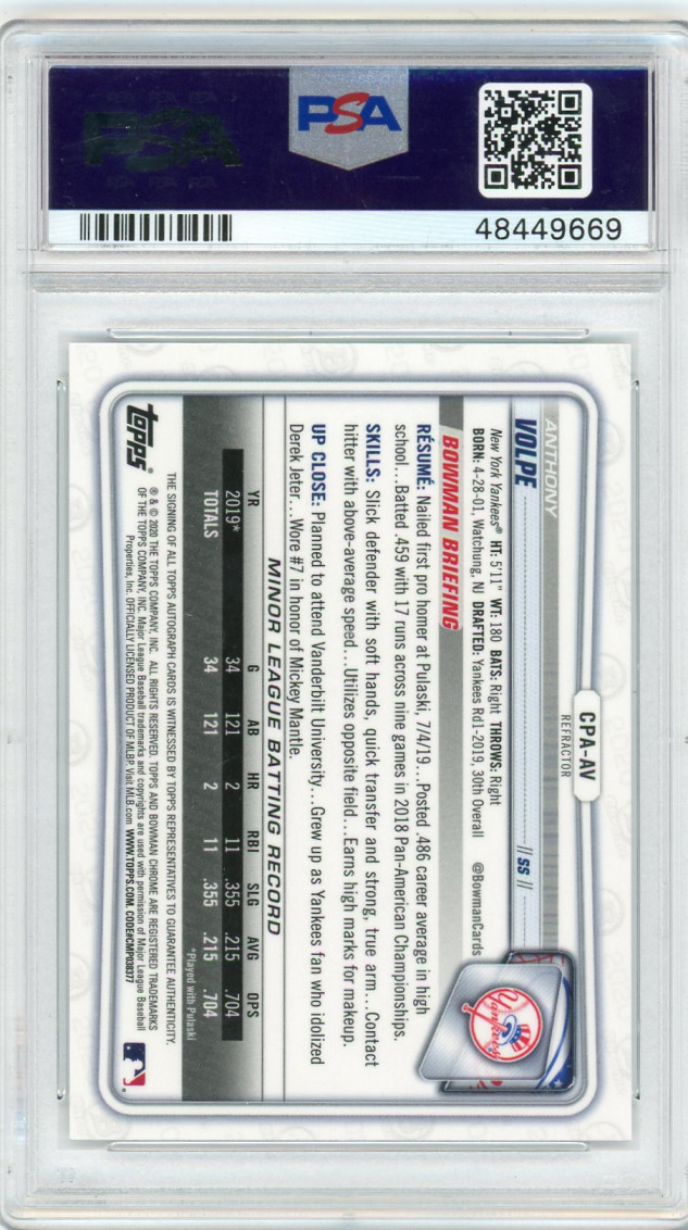 You are purchasing a 2020 Bowman Chrome Prospect Autographs Anthony Volpe #CPAAV PSA 10. You will receive the exact item in the photographs. Thank you for looking.