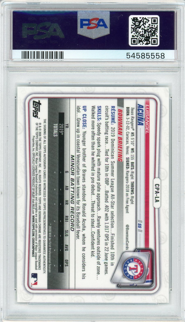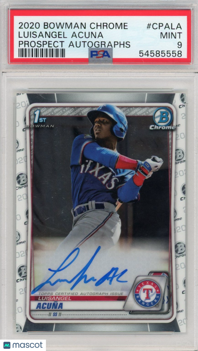 You are purchasing a 2020 Bowman Chrome Prospect Autographs Luisangel Acuna #CPALA PSA 9. You will receive the exact item in the photographs. Thank you for looking.