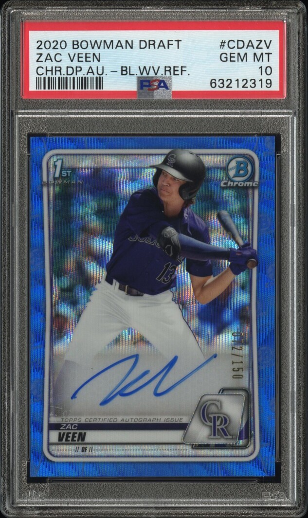 The product is a 2020 Bowman Draft Chrome ZAC VEEN PSA 10 1st Auto RC Blue Wave Refractor trading card featuring an autograph from Zac Veen of the Colorado Rockies. This card is part of the Chrome Draft Picks Autographs insert set, with a limited print run of only 150. Authenticated by Topps, this hard-signed card is a valuable addition to any baseball card collection, especially for fans of the MLB and the Colorado Rockies.
