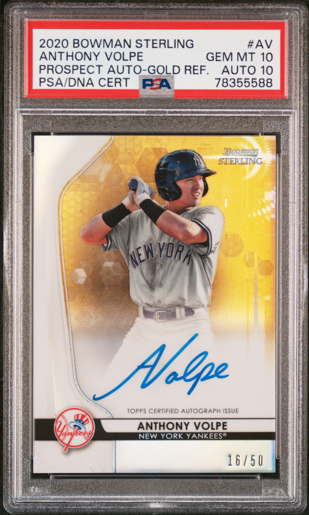 Thanks for your looking at my listing 2020 Bowman Sterling Prospect Autographs Anthony Volpe Prospect Auto-gold Ref. PSA 10. Let me know if you have any questions!
