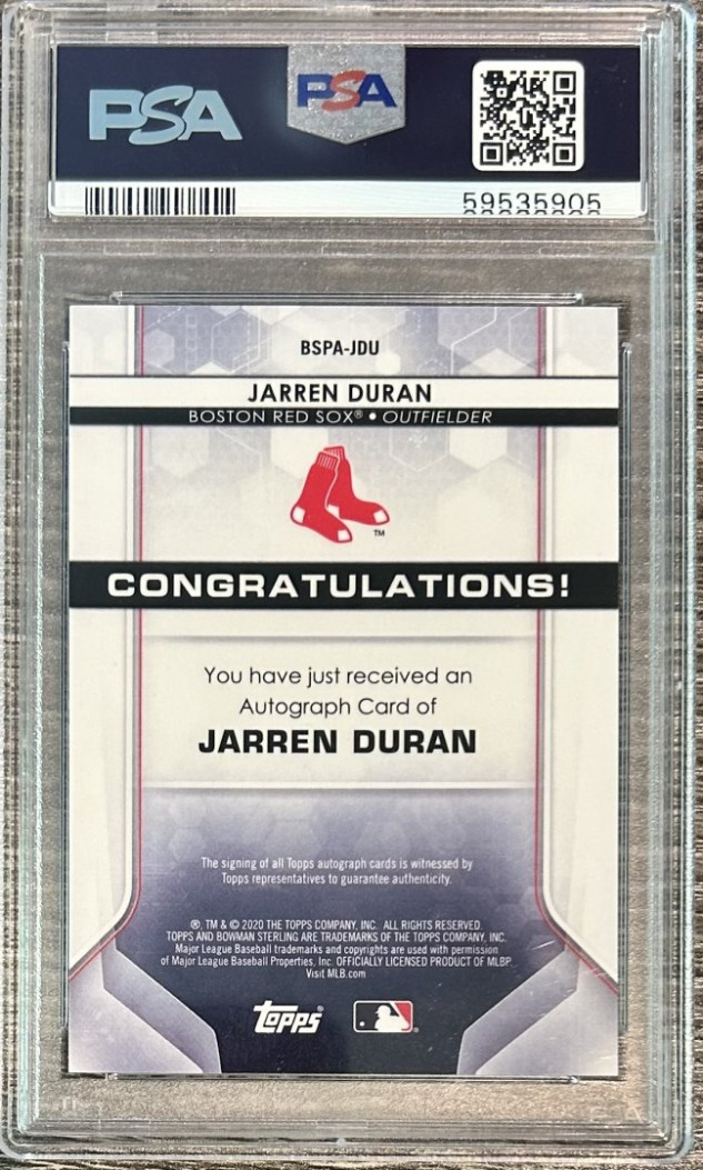 Thanks for your looking at my listing 2020 Bowman Sterling Prospect Autographs Jarren Duran Prospect Auto-blue Ref. PSA 10. Let me know if you have any questions!