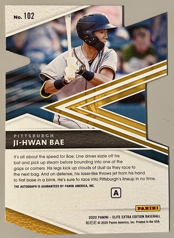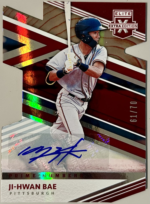 2020 Elite Extra Edition Prime Numbers A Die-Cut Signatures /70 Ji-Hwan Bae Auto is a rare and highly sought-after sports trading card featuring an autograph by player Ji-Hwan Bae. This one-of-a-kind card, part of the Panini Authentic collection, showcases Bae's signature on a die-cut design, making it a unique addition to any baseball card collection. With only 70 cards in existence, this limited edition piece is a must-have for fans and collectors alike. Perfect for Pittsburgh Pirates supporters and baseball enthusiasts, this card captures the essence of the sport in a special and exclusive way.