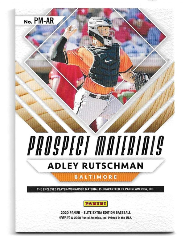 2020 Elite Extra Edition Prospect Materials #4 Adley Rutschman (RC) - Baltimore Orioles