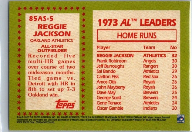 This is a nice example of a 2020 Topps #85AS-5 Reggie Jackson 1985 Topps Baseball 35th Anniversary All-Stars