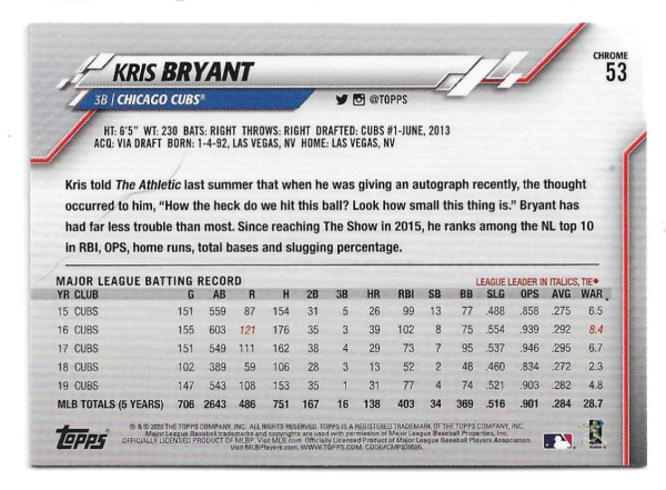 2020 TOPPS CHROME PRISM REFRACTORS #53 KRIS BRYANT