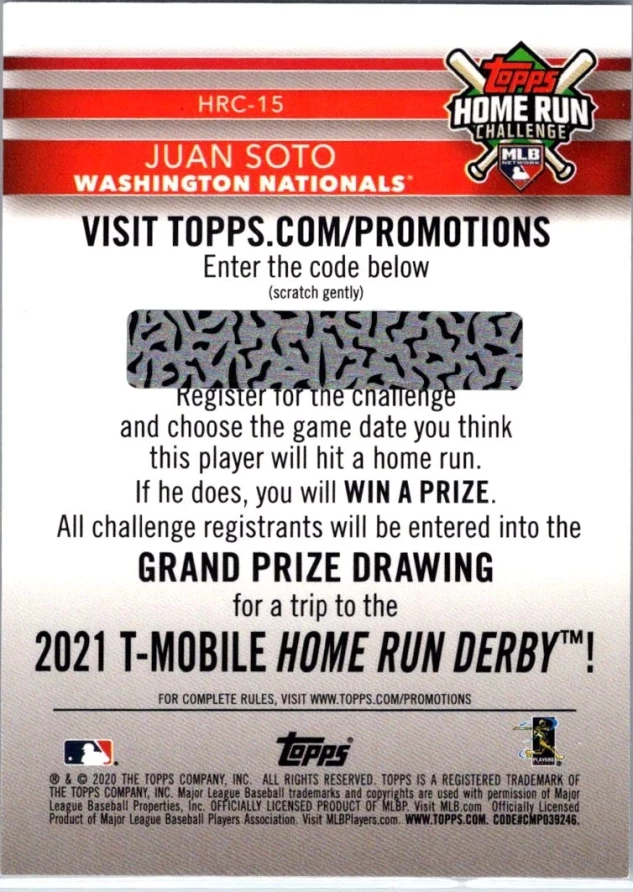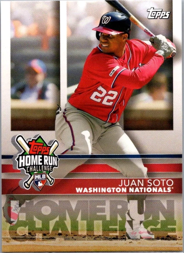 This is a nice example of a 2020 Topps #HRC-15 Juan Soto Home Run Challenge (Series Two)