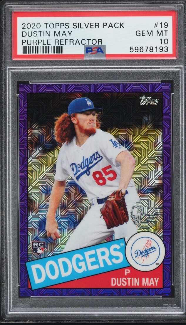 The product is a 2020 Topps Silver Pack '85 Chrome Promo Purple Refractor Dustin May rookie trading card, numbered to /75. This card is part of the Silver Pack 1985 Topps Chrome Baseball insert set, featuring the player Dustin May from the Los Angeles Dodgers. The card is a parallel variety with a purple design, serial numbered, and considered a rookie card. Produced by Topps, this baseball trading card is a collectible item from the 2020 Major League Baseball season.
