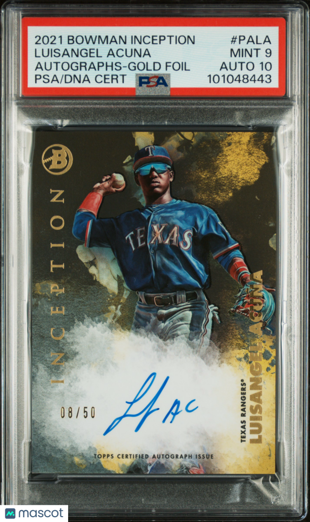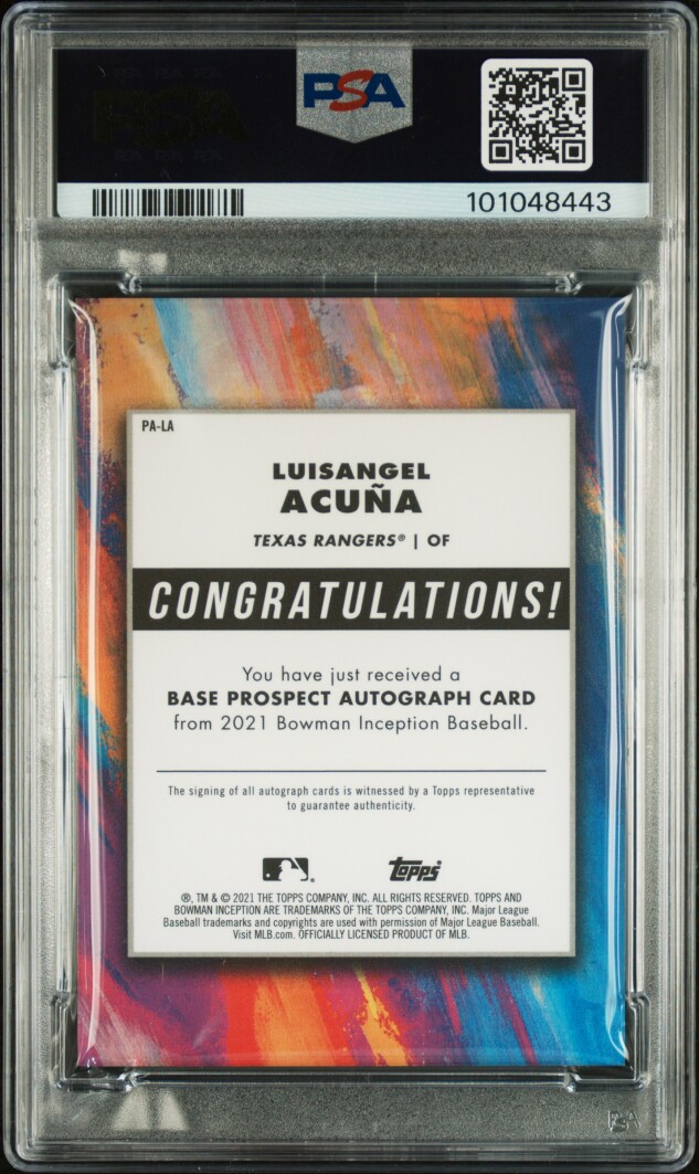 You are purchasing a 2021 Bowman Inception Autographs Luisangel Acuna #PALA Gold /50 PSA 9 Auto 10. Thank you for looking.