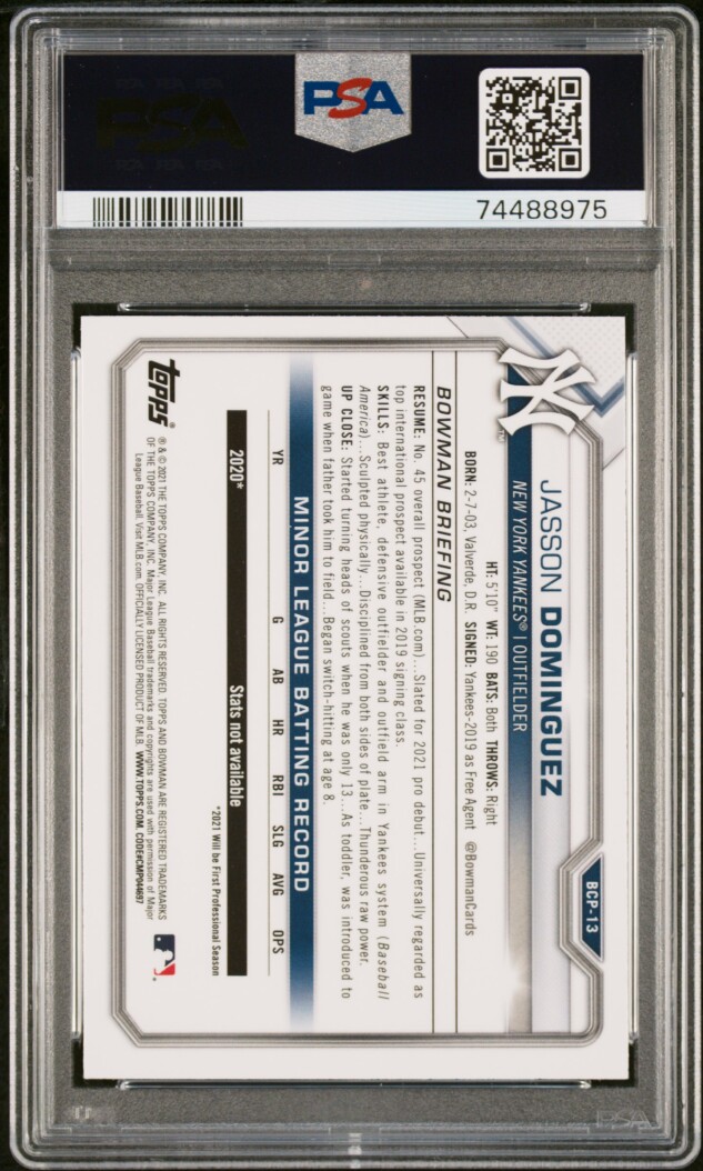 Don't miss your chance to own this highly sought-after 2021 Bowman Mega Box Chrome Jasson Dominguez rookie card, graded PSA 10 Gem Mint! With zero cards graded higher and only 115 in this elite grade, this card stands out as a true investment piece for collectors and Yankees fans alike. The vibrant chrome finish and pristine condition make it a centerpiece for any collection.
