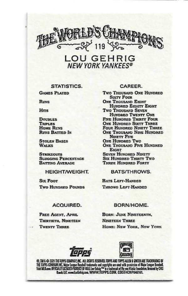 2021 TOPPS ALLEN & GINTER MINI BLACK BORDER #119 LOU GEHRIG
