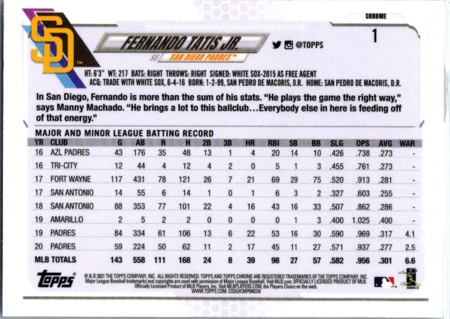 This is a nice example of a 2021 Topps Chrome #1 Fernando Tatis Jr.