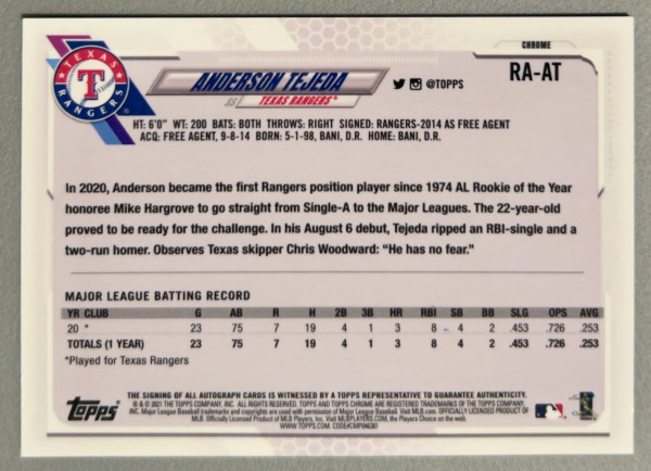 2021 Topps Chrome Baseball Rookie Auto #RA-AT Anderson Tejeda RC Texas Rangers