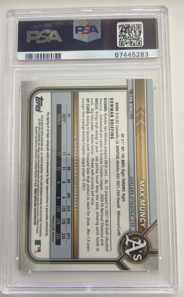 You are purchasing a 2022 Bowman Chrome Prospect Autographs Max Muncy #CPAMMU Autograph PSA 10. You will receive the exact item in the photographs. Thank you for looking.