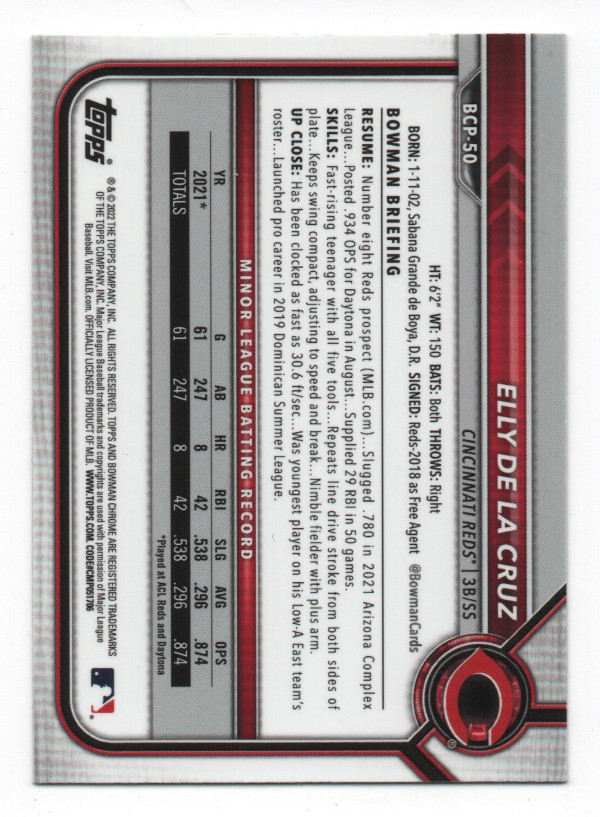 2022 Bowman Chrome Prospects #BCP-50 Elly De La Cruz RC