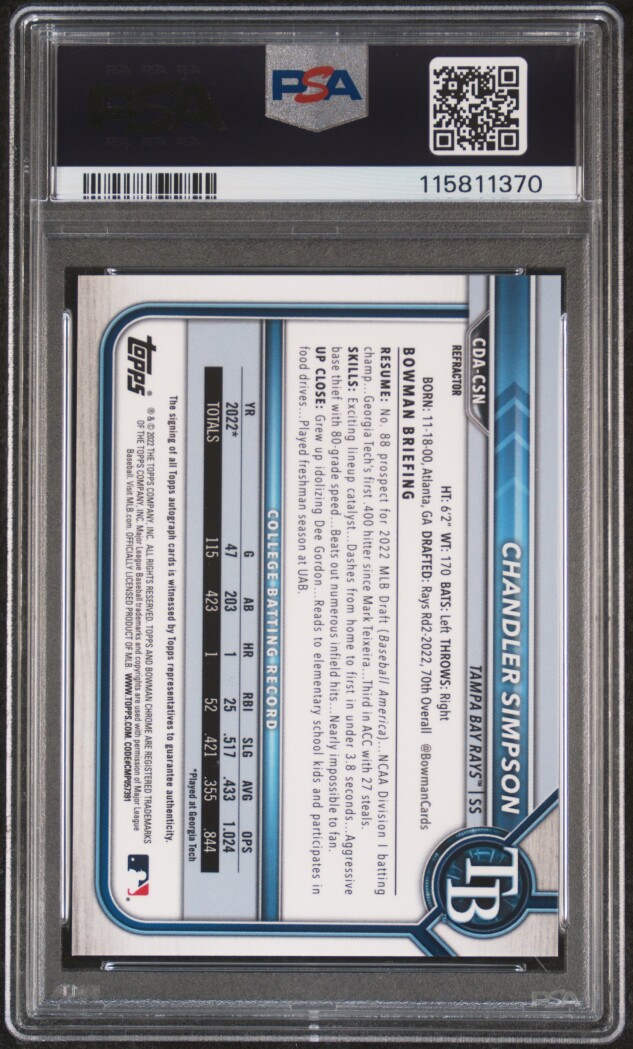 You are purchasing a 2022 Bowman Draft Chandler Simpson #CDACSN Refractor /499 PSA 10. Thank you for looking.