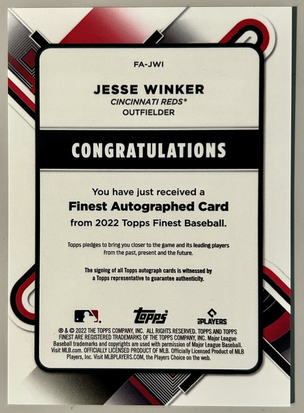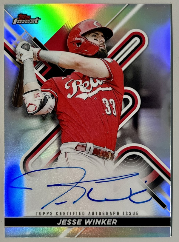 2022 Finest Autographs Refractors #FA-JWI featuring an autograph of Jesse Winker from the Cincinnati Reds. This hard-signed card is from the 2022 Topps Finest set, authenticated by Topps and in Near Mint/Mint condition. A must-have for any modern baseball card collector, this single card showcases Winker's signature on a refractor parallel, adding a special touch to any sports trading card collection.