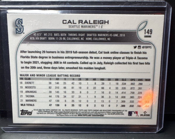 2022 Topps Chrome Baseball Cal Raleigh #149 (RC) Seattle Mariners Rookie