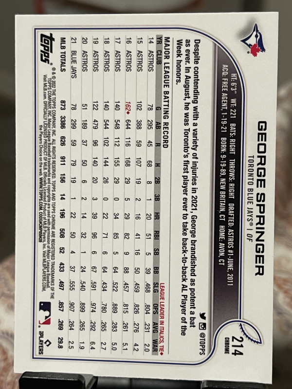 2022 Topps Chrome - George Springer #214