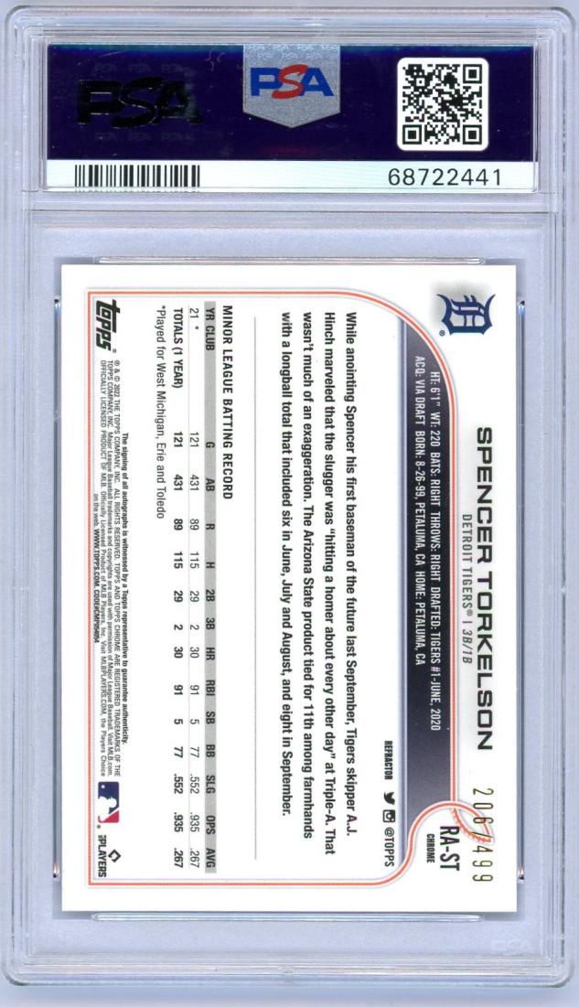 You are purchasing a 2022 Topps Chrome Rookie Autographs Spencer Torkelson #RAST PSA 10. You will receive the exact item in the photographs. Thank you for looking.