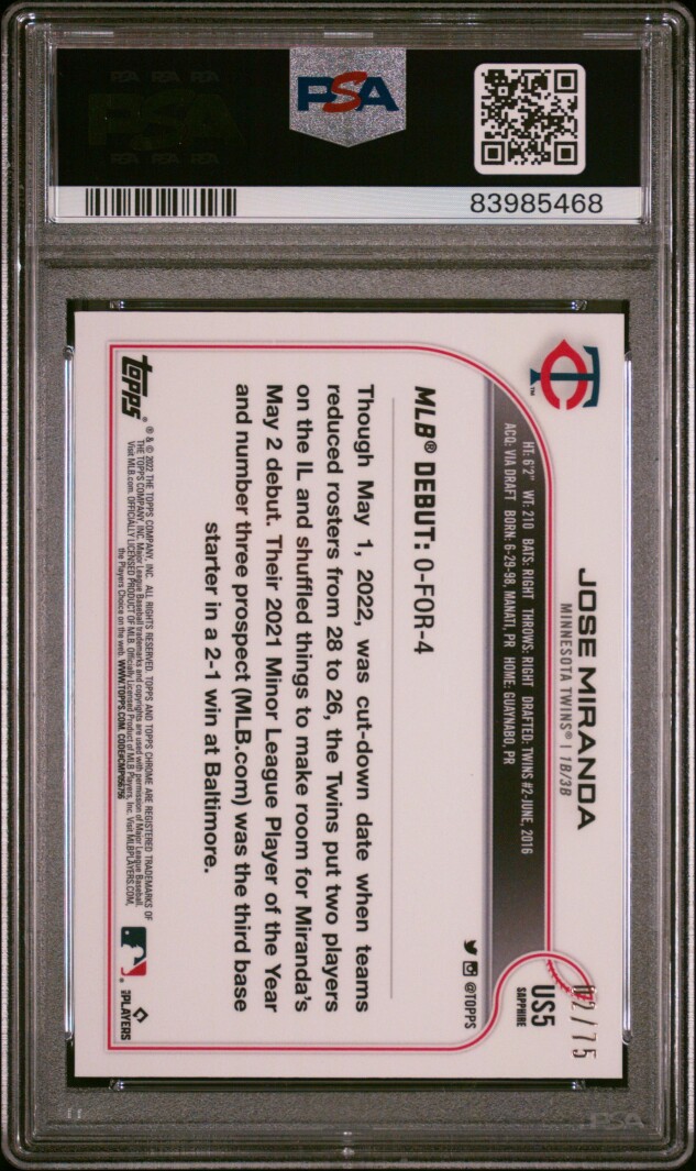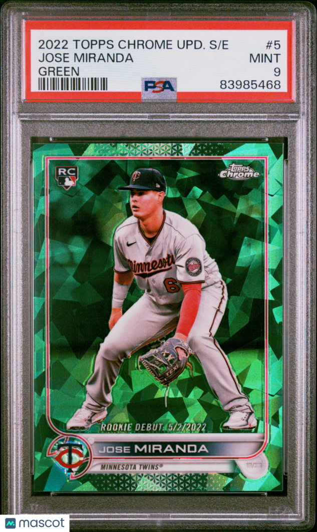 You are purchasing a 2022 Topps Chrome Update Sapphire Jose Miranda #5 Green RC /75 PSA 9. Thank you for looking.