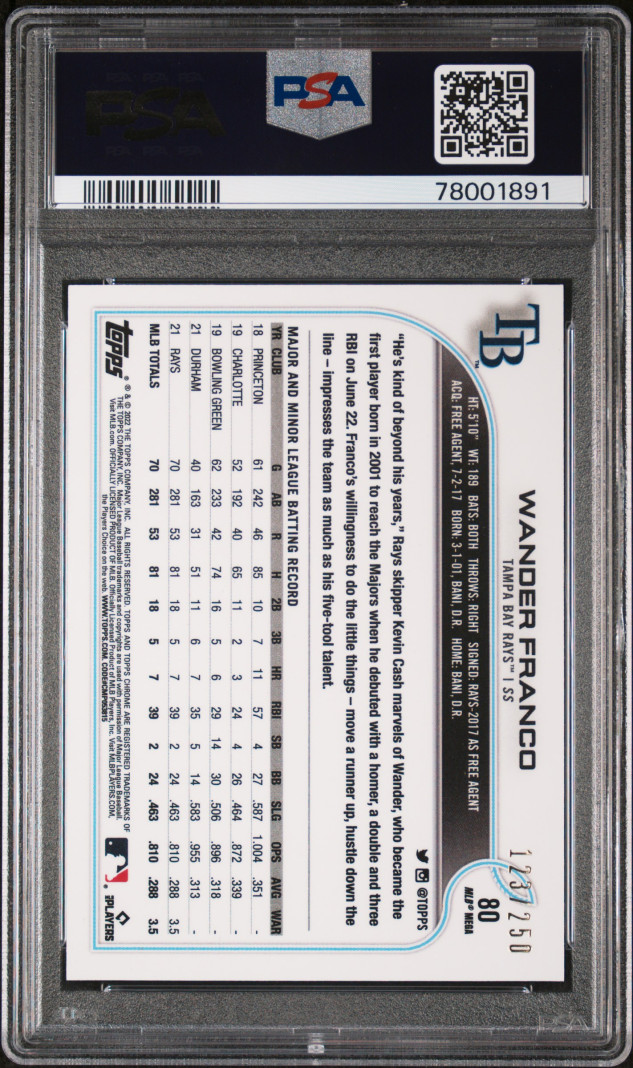You are purchasing a 2022 Topps Chrome Logofractor Edition Wander Franco #80 PSA 9. You will receive the exact item in the photographs. Thank you for looking.