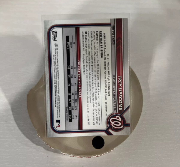 2022 Trey Lipscomb 1st Bowman Draft SIGNED RC Paper AUTO #BD-197 Washington Nats
