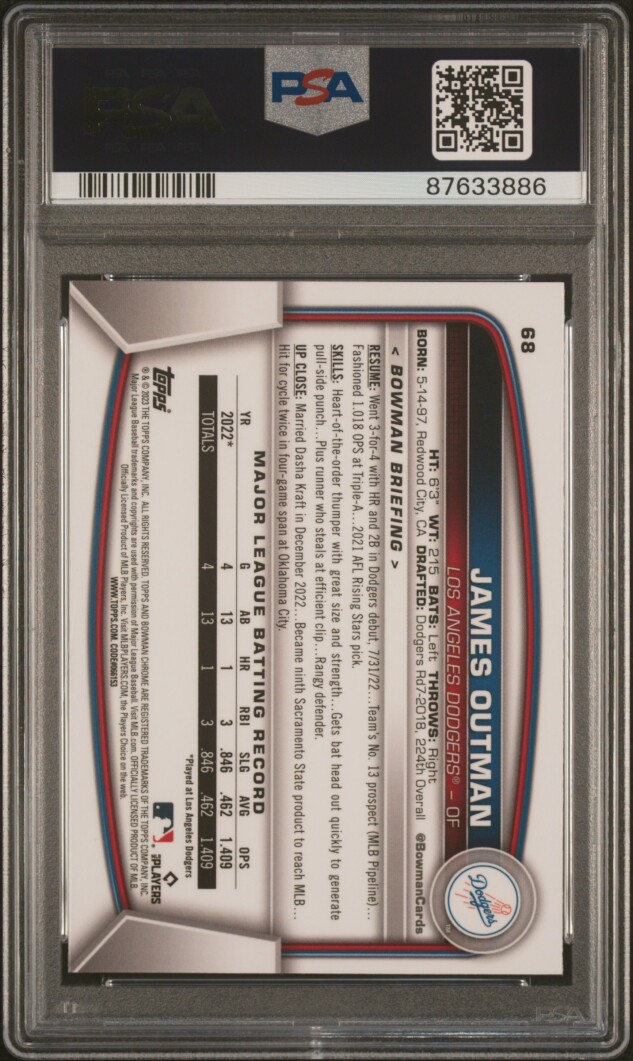 The product is a 2023 Bowman Chrome Sapphire James Outman rookie trading card graded as a PSA 10 Gem Mint. This card features a sleek Sapphire parallel design and is part of the Bowman Chrome set. As a rookie card, it holds special significance for collectors and fans of James Outman, a promising player in the baseball world. With the assurance of a PSA 10 grading, this card is sure to be a prized possession for any trading card enthusiast.