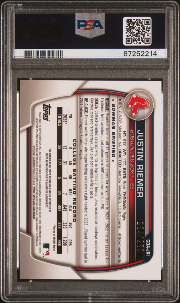 2023 Bowman Draft Chrome Prospect Autograph Justin Riemer Chr Prospect Au-Purple Ref