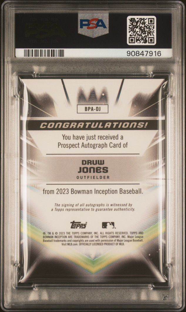 You are purchasing a 2023 Bowman Inception Autographs Druw Jones #BPADJ PSA 9. You will receive the exact item in the photographs. Thank you for looking.