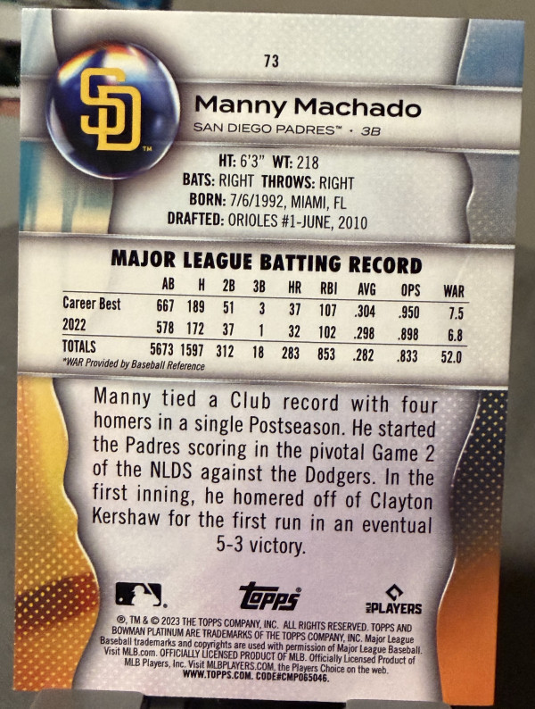 2023 Bowman Platinum Manny Machado #73 Refractor Padres