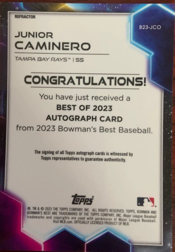 2023 Bowman's Best B23-JCO Junior Caminero Best of 2023 Auto Refractor Tampa Bay
