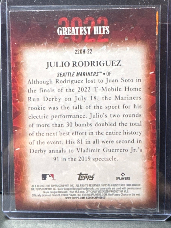 2023 Topps 2022 Greatest Hits 22GH-22 Julio Rodriguez Seattle Mariners HR Derby
