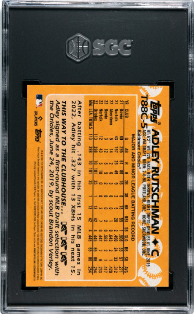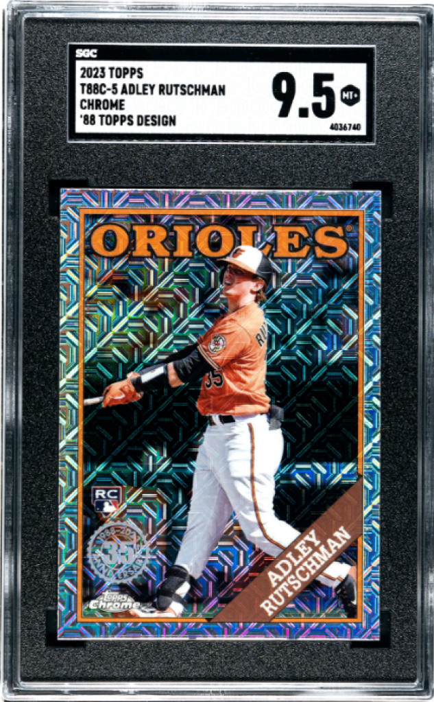 88 Topps Design Chrome Adley Rutschman Silver Pack Mojo Refractor #T88C-5, beautifully slabbed in an SGC 9.5 Mint+. This hobby-exclusive Silver Pack insert combines the iconic 1988 throwback design with a premium "Mojo" refractive sparkle that makes it one of the most aesthetically striking rookie cards in the set. As the Orioles' primary backstop and a former first overall pick, Rutschman is an elite candidate for a major bounce-back 2026 season following a quiet 2025. Grab this high-grade, nostalgic rookie card while the value is prime before the 2026 Heisman-caliber