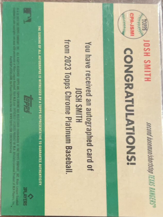 You are purchasing a 2023 Topps Chrome Platinum Josh Smith #CPA-JSMI RC. You will receive the exact item in the photographs. Thank you for looking.
