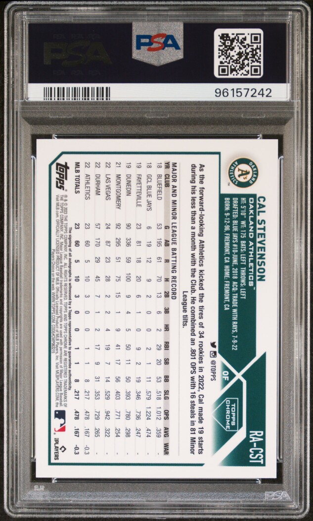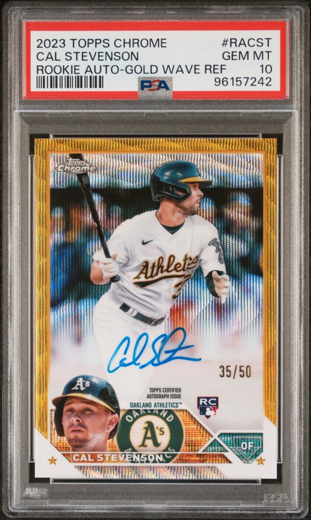 The product is a 2023 Topps Chrome Gold Wave Refractor Cal Stevenson Rookie Auto trading card, graded a 10 by PSA. This rare card features a hard-signed autograph from Cal Stevenson, a member of the Oakland Athletics in Major League Baseball. With a limited edition of only 50 cards produced, this highly collectible item is a valuable addition to any baseball card collection. Topps, a well-known manufacturer in the sports trading card industry, ensures the authenticity of the autograph through Professional Sports Authenticator (PSA) certification.