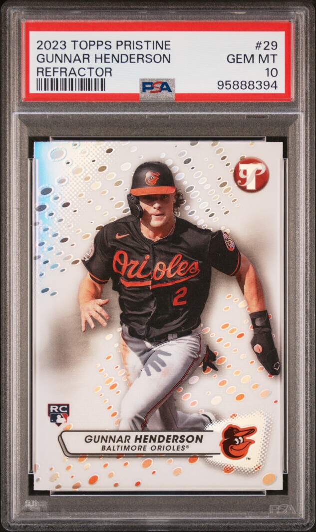 The product is a 2023 Topps Pristine Gunnar Henderson Refractor #29 RC Orioles PSA 10 trading card. This baseball card features the rookie player Gunnar Henderson from the Baltimore Orioles, graded a perfect 10 by Professional Sports Authenticator (PSA). It is part of the Major League Baseball (MLB) set for the 2023 season. This highly collectible card is a valuable addition to any sports memorabilia or trading card collection for fans of the MLB and baseball enthusiasts.
