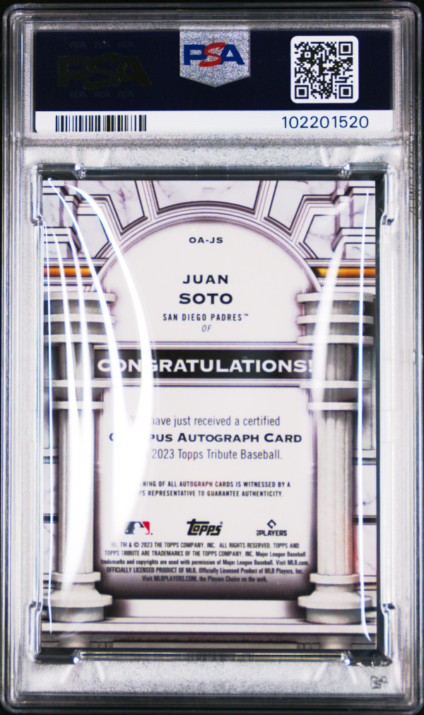 You are purchasing a 2023 Topps Tribute Olympus Autograph Juan Soto #OAJS 080/100 PSA 9. You will receive the exact item in the photographs. Thank you for looking.
